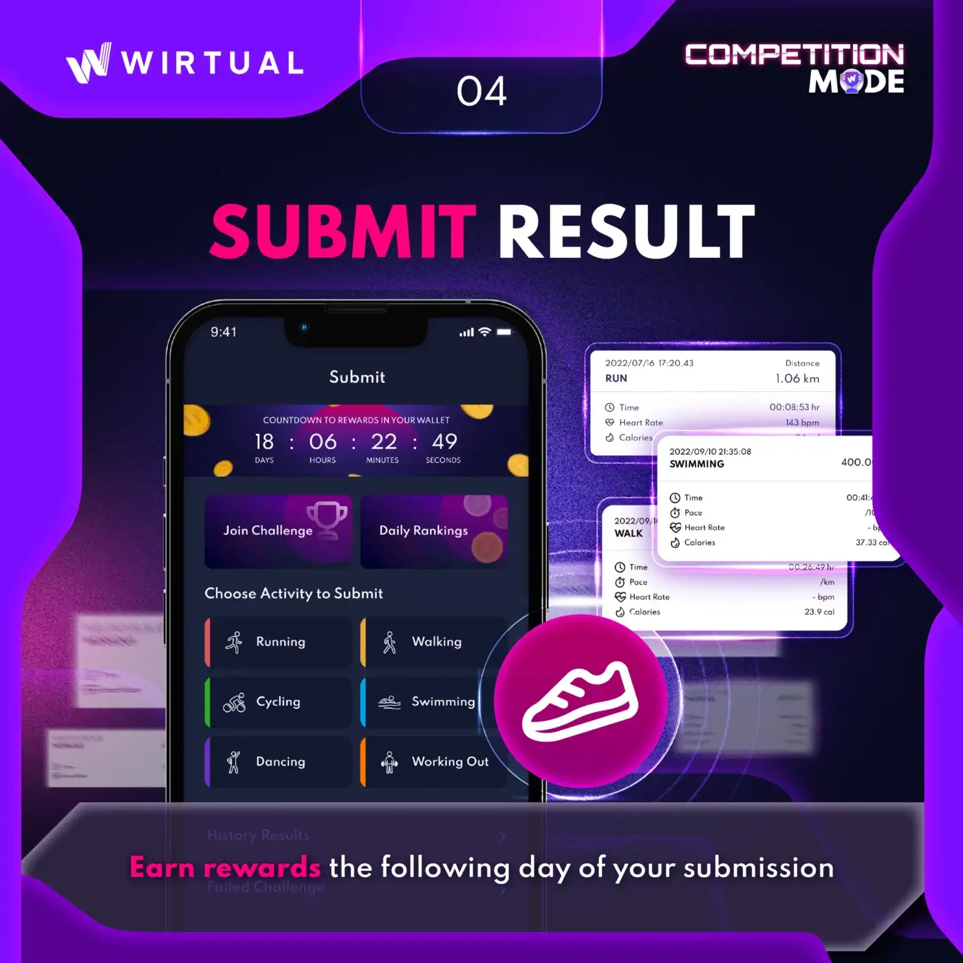 Ang pagsusumite ng mga resulta ay maaaring gawin sa isang pag-click lamang. Kung matagumpay na nakonekta ang iyong smart watch, kapag natapos mo ang isang workout sa iyong smart watch, awtomatikong mai-import ang iyong data sa WIRTUAL.